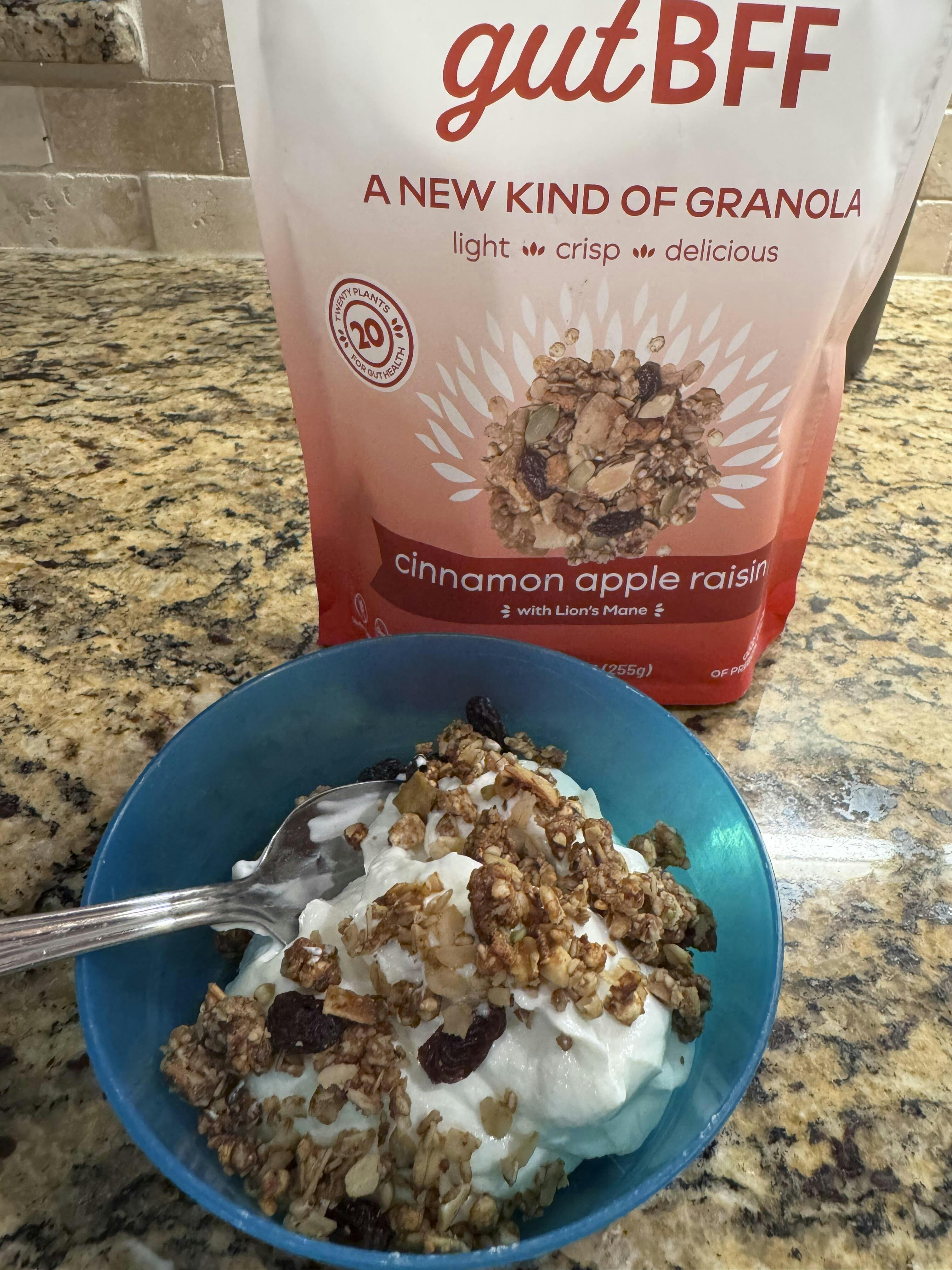 Cinnamon Apple Raisin Ingredients: Oats, Honey, Raisins, Coconut Oil, Almond Butter (Almonds, Salt), Buckwheat, Dried Apples, Mixed Nuts (Cashews, Almonds, Walnuts), Coconut Sugar, Chia Seeds, Hemp Seed, Sesame Seeds, Pumpkin Seeds, Sunflower Seeds, Golden Flax Meal, Coconut, Crispy Quinoa, Crispy Brown Rice, Puffed Millet, Cinnamon, Lion’s Mane Mushroom, Baobab Powder, Salt
